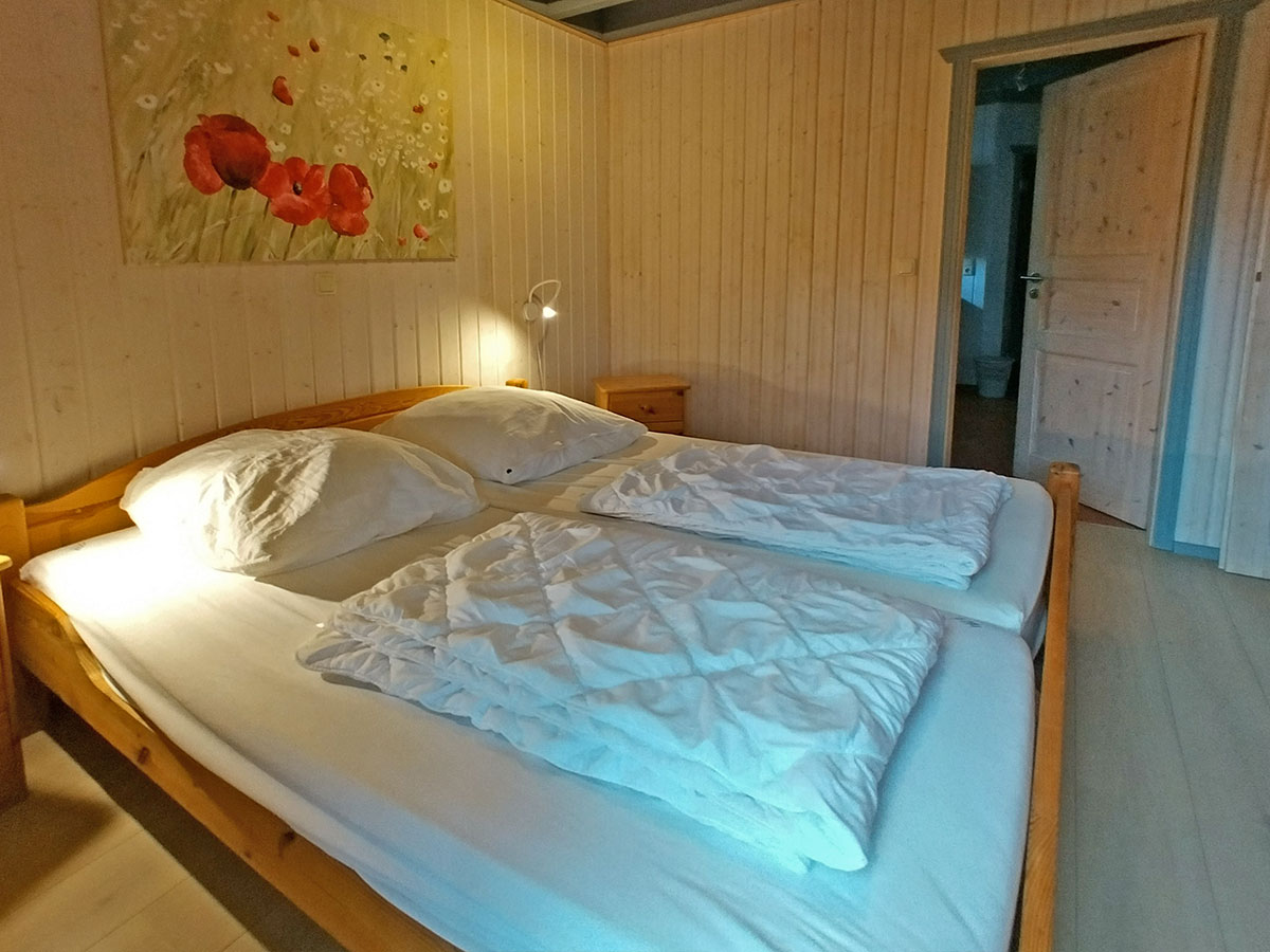 - Im Schlafzimmer unten finden Sie ein Doppelbett und einen Vollholz Kleiderschrank. Der Boden ist mit Laminat ausgelegt. So ist dieses Schlafzimmer weniger staubbelastet als Räume mit Teppich.