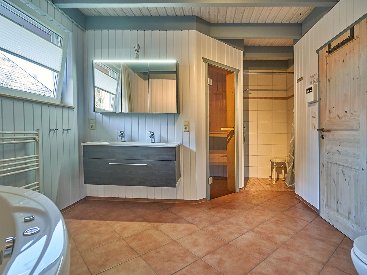 Im Badezimmer sorgt die Fußbodenheizung für gemütliche Wärme. - Die Sauna hat eine moderne Steuerung bei der auch Zeitvorwahl möglich ist. In der Sauna finden Sie alles nötige Zubehör für einen entpannten Saunagang.